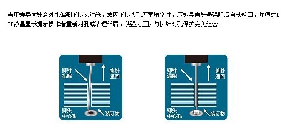 5、無(wú)條件限制的緊固裝訂:獨(dú)創(chuàng)的壓鉚保護(hù)系統(tǒng)(專利)。強(qiáng)力壓鉚機(jī)構(gòu),緊固的壓鉚效果,但當(dāng)特殊意外壓鉚針扎偏到下鉚頭邊緣,或因裝訂物未鉆透嚴(yán)重堵塞下鉚頭孔時(shí)鉚針自動(dòng)返回,并通過(guò)LCD液晶顯示提示操作者重新對(duì)孔或清理紙屑。全面消除了壓鉚機(jī)構(gòu)的損壞。解決了壓鉚機(jī)構(gòu)保護(hù)的瓶頸問(wèn)題。屬國(guó)內(nèi)首創(chuàng)。